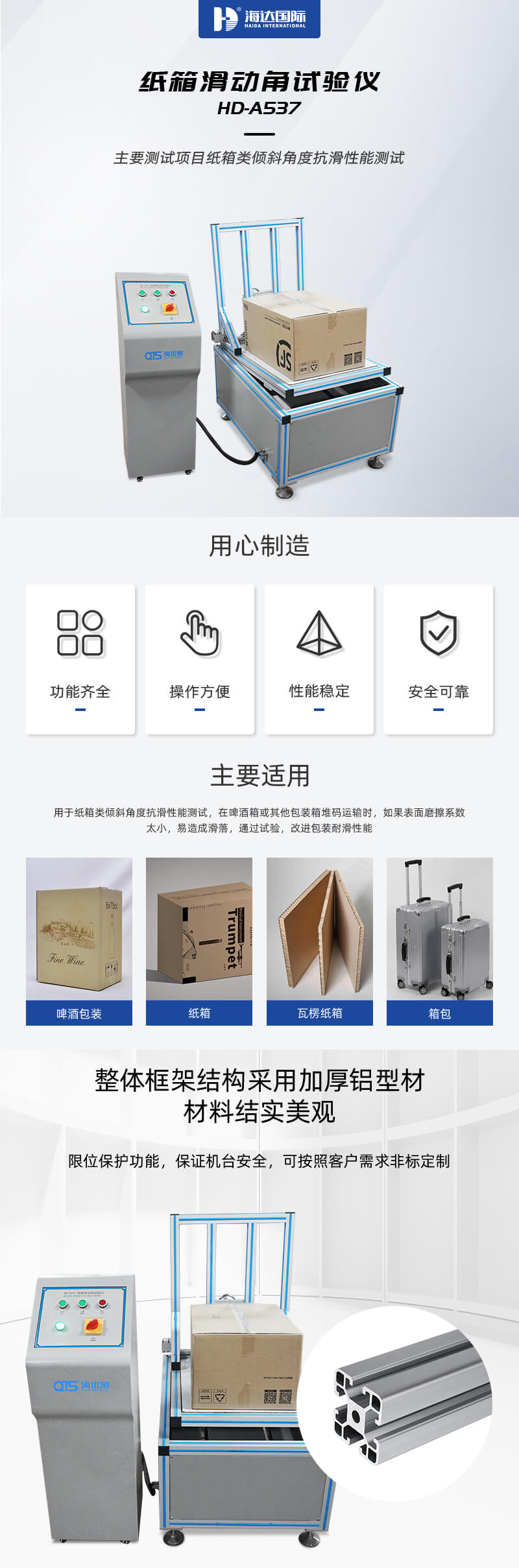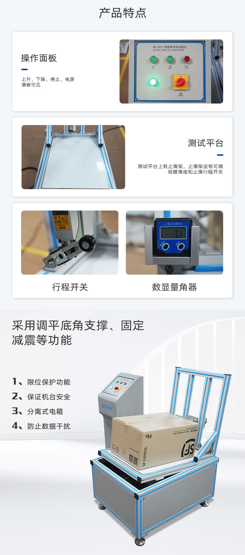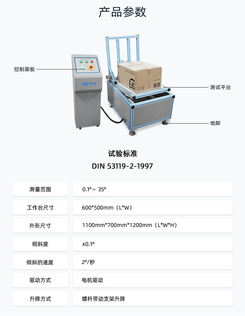 紙箱滑動角試驗儀將紙箱滑動角測試儀用于紙箱類傾斜角度抗滑性能測試,在啤酒箱或其他包裝箱堆碼運輸時,如果表面磨擦系數太小,易造成滑落,通過試驗,改進包裝耐滑性能。