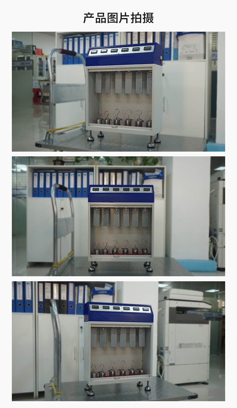 該儀器測試方法是將膠帶粘于測試鋼片上,下端懸掛標準荷重,經(jīng)過一段時間后,測量膠帶下滑距離或膠帶粘著時間用來評定膠帶粘著的持久性。