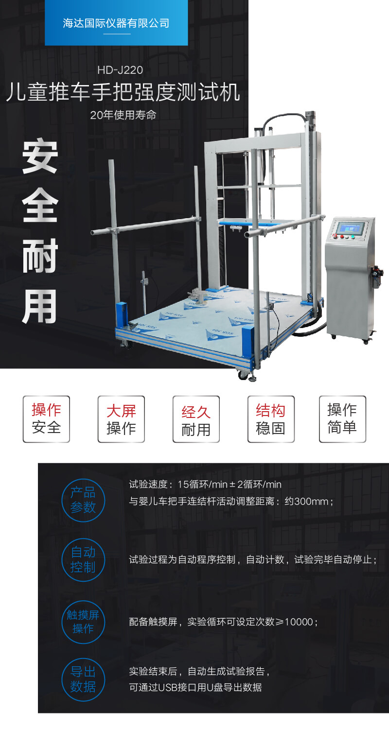 兒童推車手把強(qiáng)度測試儀適用于檢測兒童推車手把強(qiáng)度,模擬兒童推車手把多次使用后其結(jié)構(gòu)件的完整性和功能是否缺失。